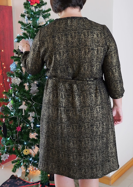 The fabric I chose from StyleMaker Fabric's Touch of Shine holiday collection was this gorgeous black crepe with a sparkly golden crosshatch. It's lightweight, with a fabulous drape and fun sponge-y texture. It probably has some poly content as it was not the easiest to iron, but the stitches sink into the fabric easily and are virtually invisible (ask me how I know... unpicking a mistake was not easy!). Easy to sew, less easy to iron! I wouldn't say the texture is soft; it's rather rough, but not itchy. The sparkle is only on one side.